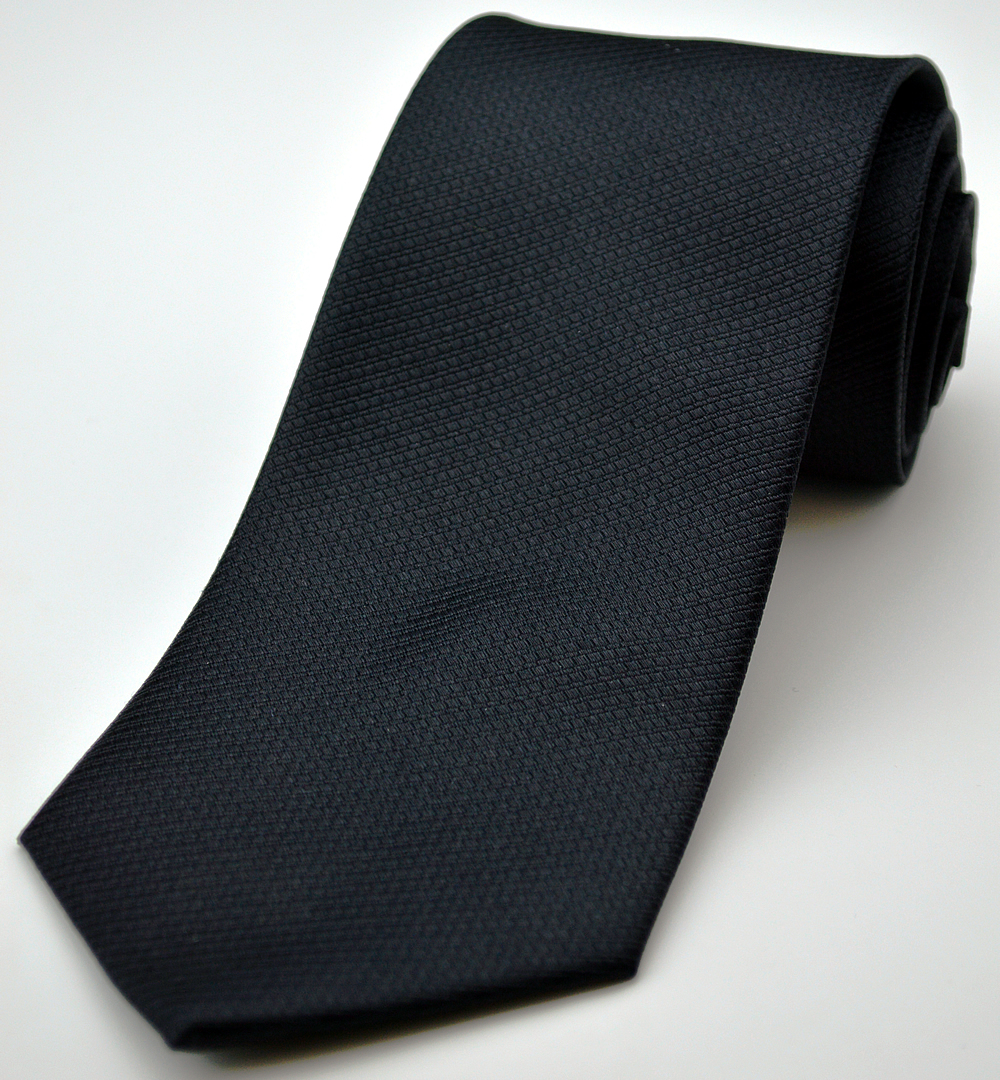 This 100% silk tie is crafted from a textured weave. This black necktie is a formal necktie and can be worn very formally, or dressed down. It is suitable for weddings and even everyday use.