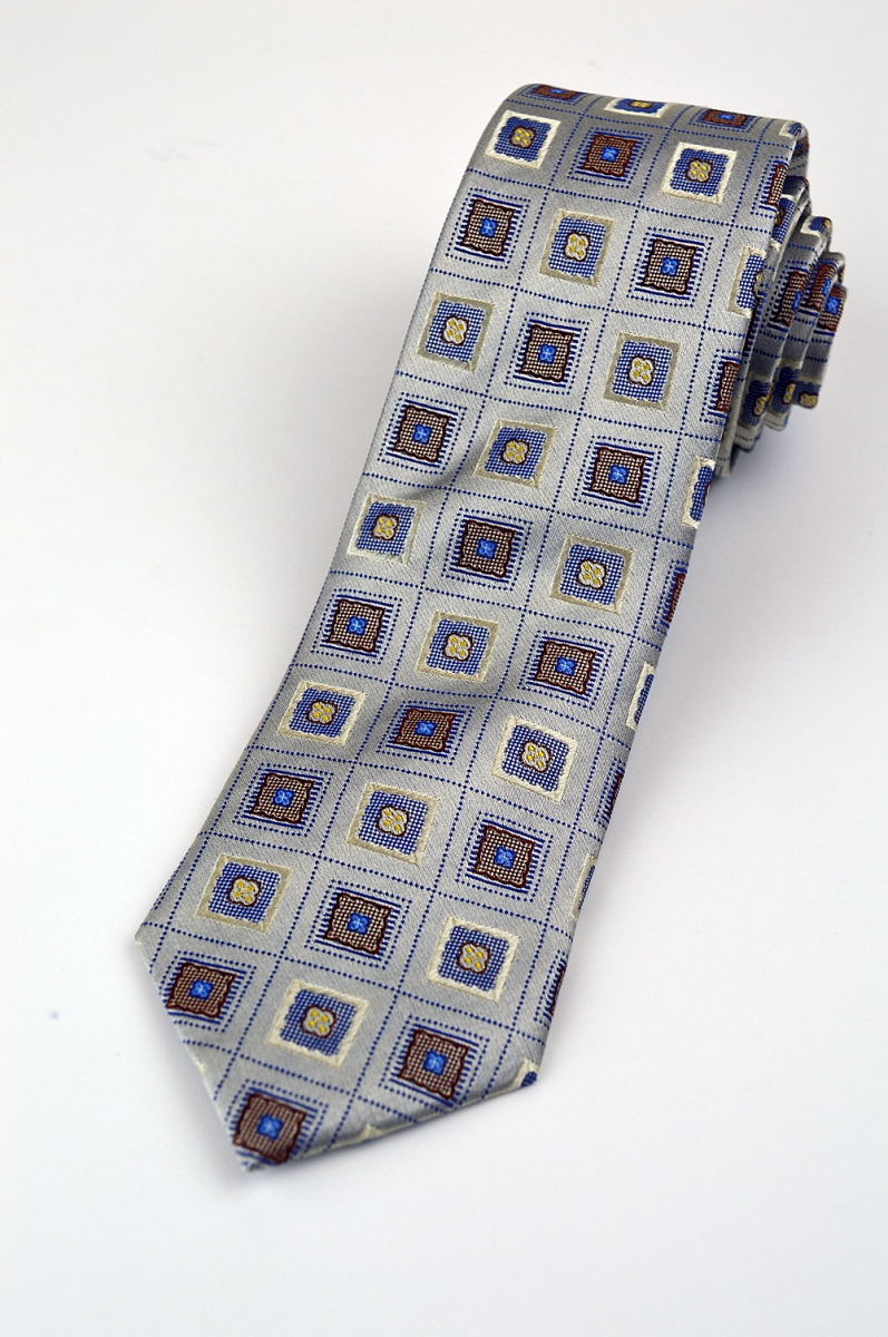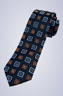 Tie your professional wear together with this mens ivory necktie. Offering a classic look, with blue and brown box design on navy background.
